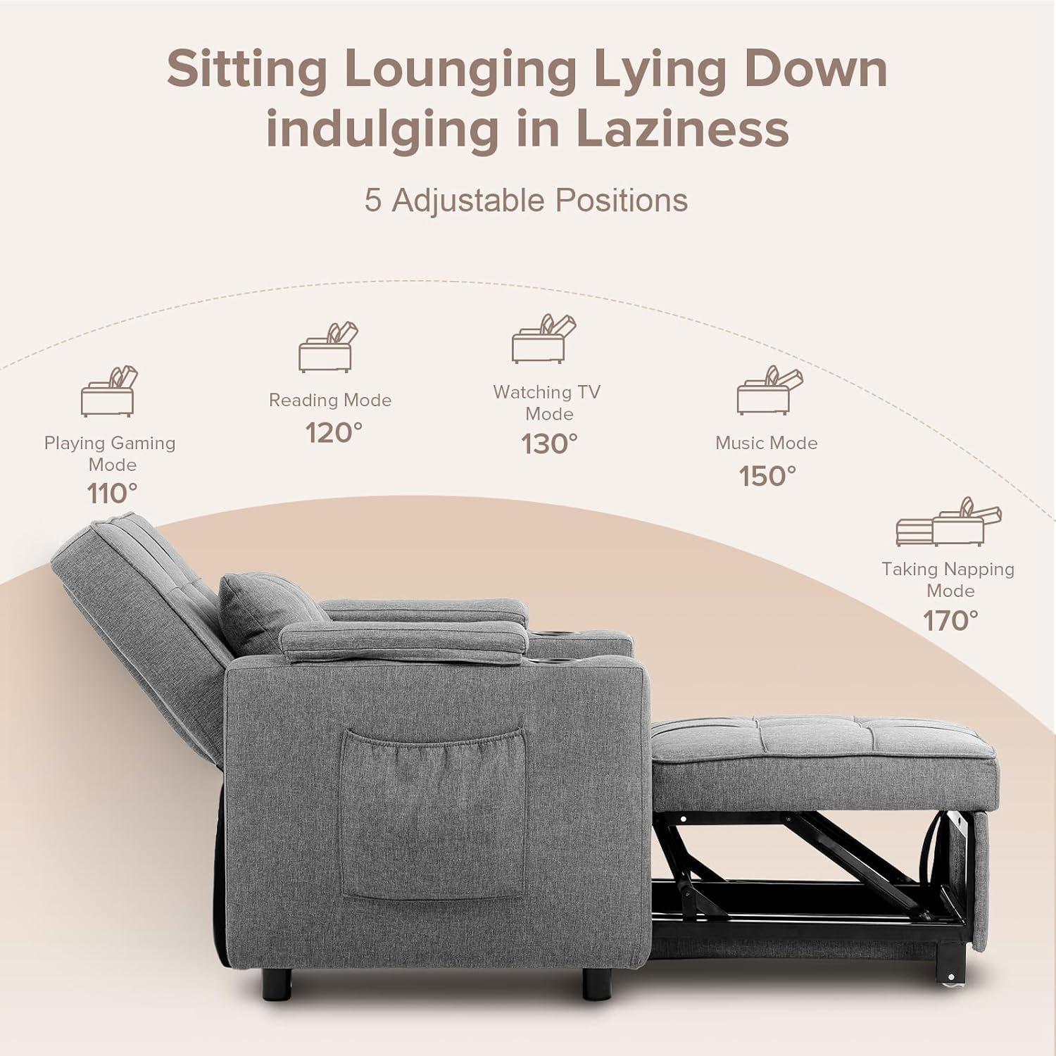 • Respaldo ajustable: disfruta de cinco ángulos reclinables ajustables (110°, 120°, 130°, 150° y 170°) para personalizar tu posición para el trabajo, la relajación o el sueño. Las patas de apoyo ocultas añaden estabilidad adicional para la tranquilidad