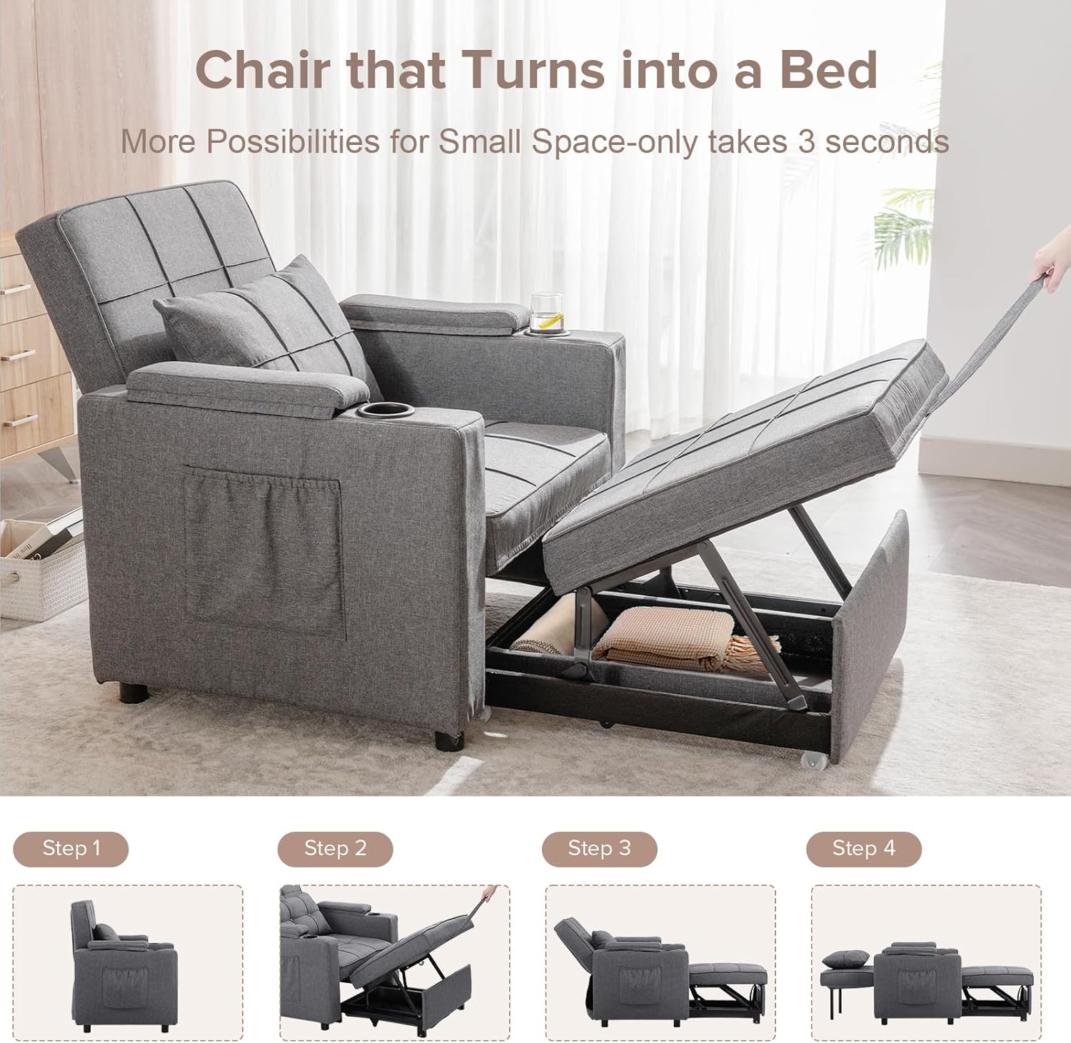 • Diseño convertible 3 en 1: transforma esta silla en un acogedor sofá, tumbona o cama de tamaño completo con facilidad. Perfecto para espacios compactos como dormitorios, apartamentos o habitaciones de invitados, es la solución ideal para ahorrar espacio sin sacrificar la comodidad