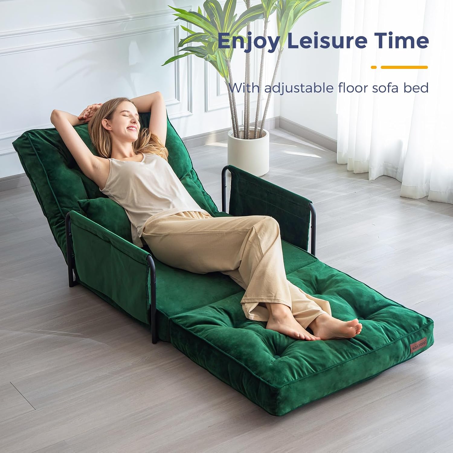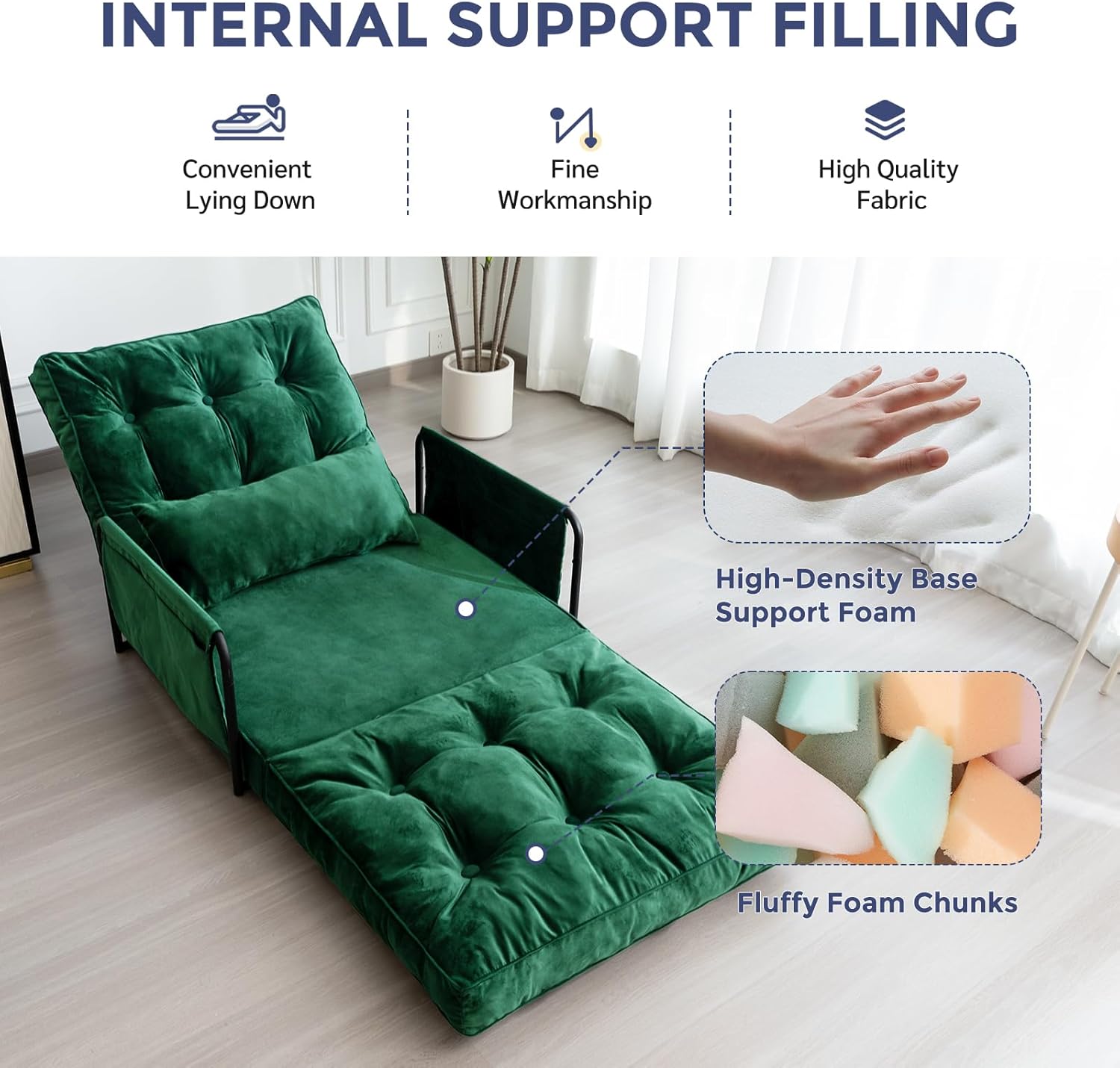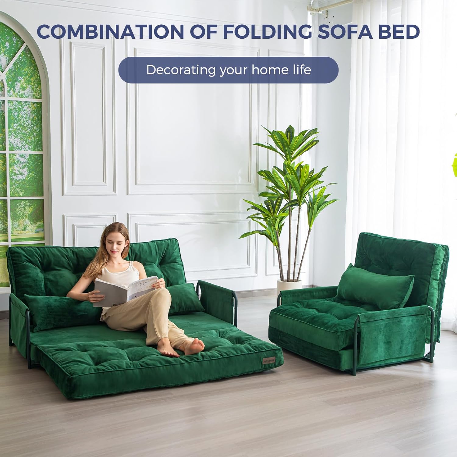 • Tela de terciopelo y relleno de alta calidad: el sofá cama cuenta con una experiencia de asiento lujosa y cómoda, gracias a su tela de terciopelo suave y resistente. Incorpora una mezcla de trozos de espuma esponjosa y espuma base de apoyo de alta densidad, asegurando una comodidad, estabilidad y durabilidad óptimas para un asiento acogedor y relajante o encuentro de sueño