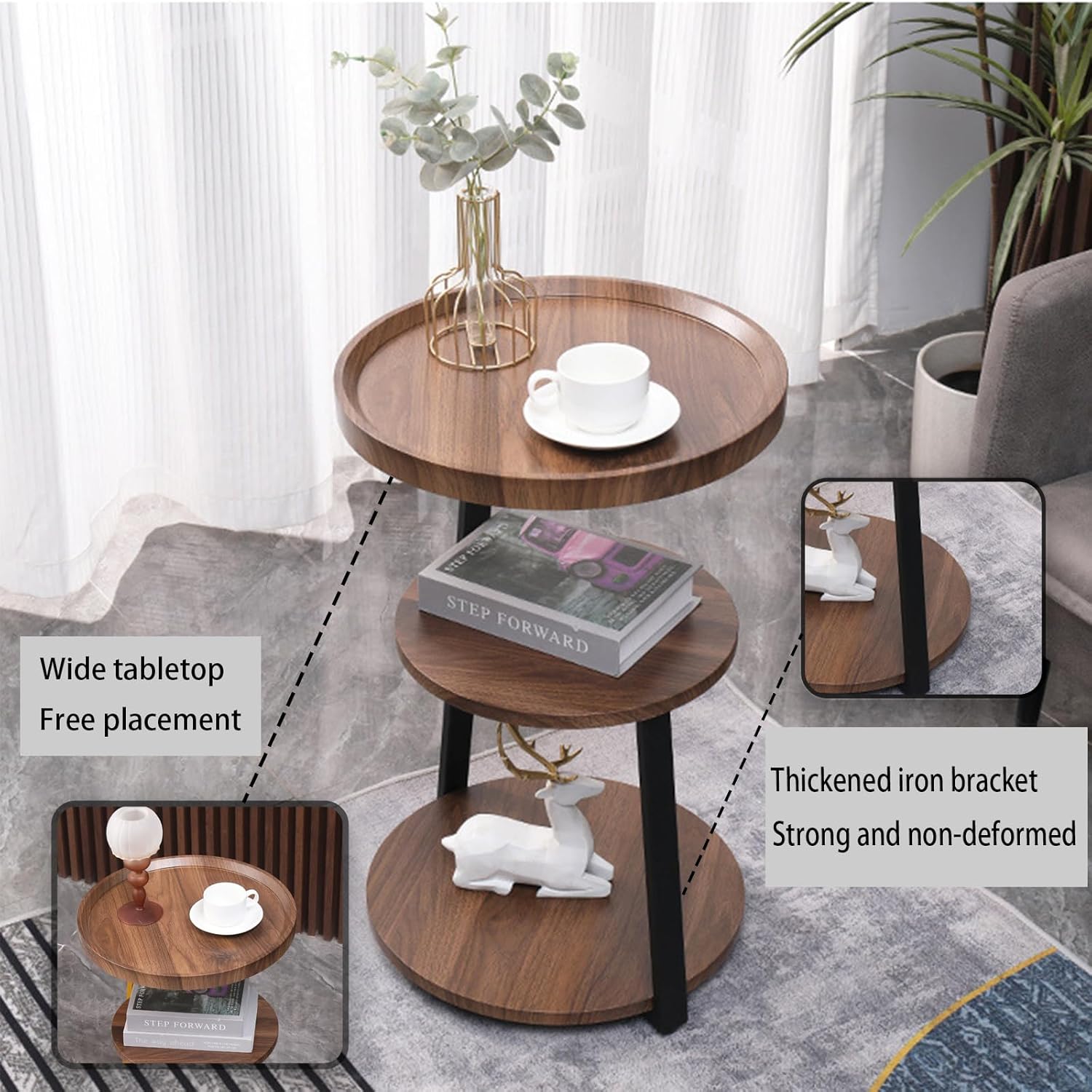 - 💐 【Disponible en múltiples escenas】 La mesa auxiliar redonda de tres capas es perfecta para tomar café, leer periódicos y contemplar el amanecer y el atardecer en el balcón por la mañana o por la noche. Colóquelo en el dormitorio como una pequeña mesita de noche, que es conveniente y está al alcance de la mano. Puede sentarse y leer un libro, tomar té y disfrutar de una vida cómoda.